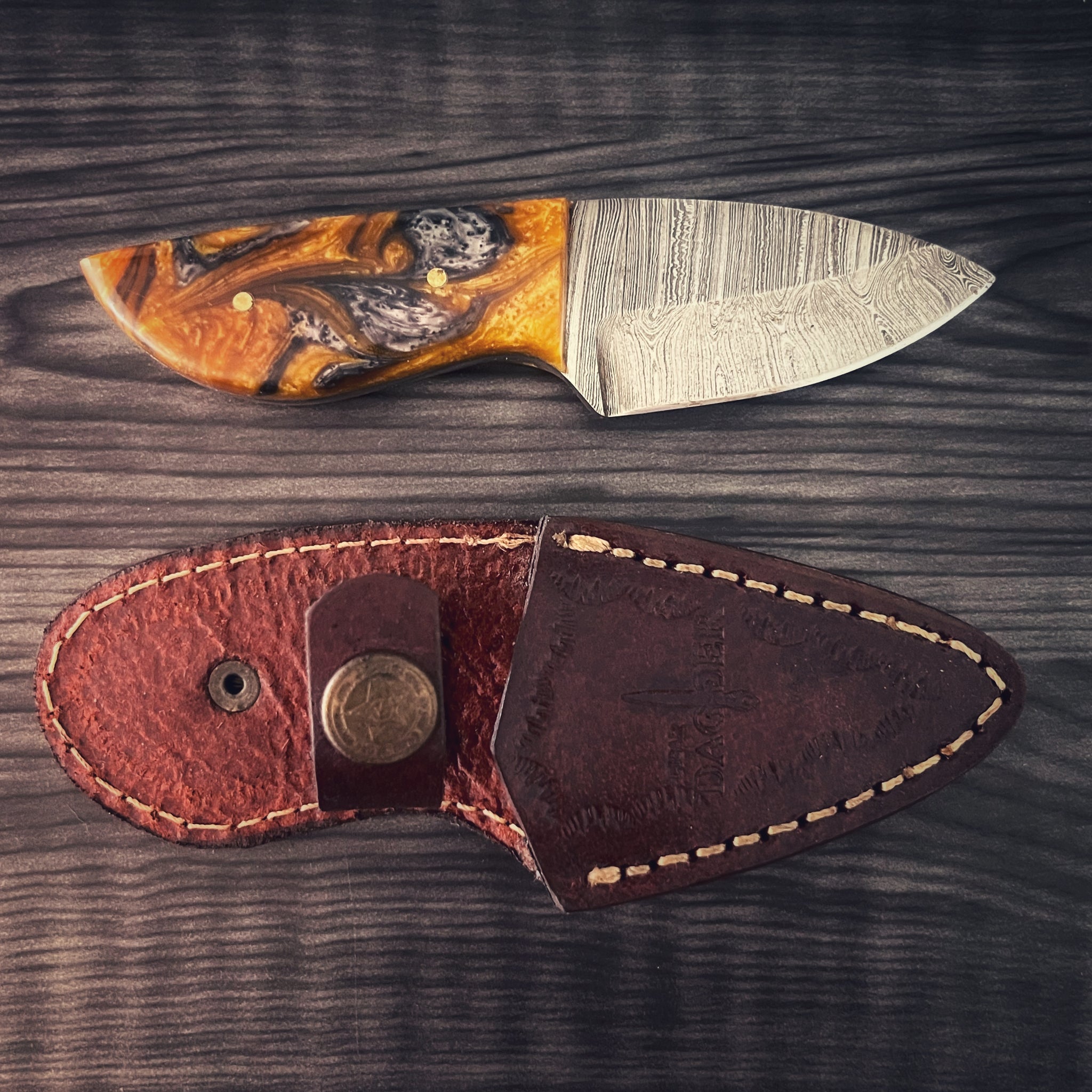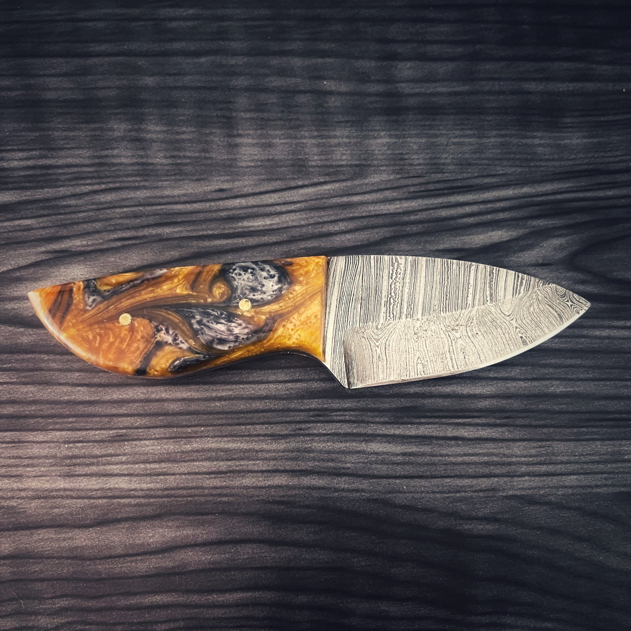 Equally bold in spirit, the resin-handled model showcases an orange and brown swirl design, blending art with resilience. Also measuring 5½ inches from end to end, this knife is a 2½-inch Damascus blade and mirrors the performance of its wooden counterpart—razor-sharp, durable, and ready for the field or display.
